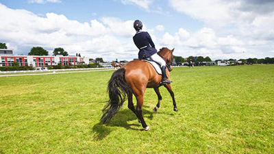 配備龍頭與領(lǐng)繩之牽馬步驟需要牽馬時,應(yīng)于馬匹內(nèi)側(cè)馬頸位置進行,左手把領(lǐng)繩繩尾盤成繩圈,右手握緊領(lǐng)繩鐵環(huán),離開馬頭約20厘米的位置。牽馬前進時,騎師眼睛向前進方向直望,位于馬匹內(nèi)側(cè)馬頸位置,堅定的一步一步向前走。切記不可望向馬匹,否則馬匹則可能停步不前行。若馬匹拒絕前進,不可強拉領(lǐng)繩,應(yīng)用左手領(lǐng)繩繩尾輕輕掃向馬匹腹部,或把馬頭向外側(cè)推動,待馬匹前腿移動時,再牽馬前進。需要牽馬轉(zhuǎn)彎時,切記要向外側(cè)轉(zhuǎn)動...